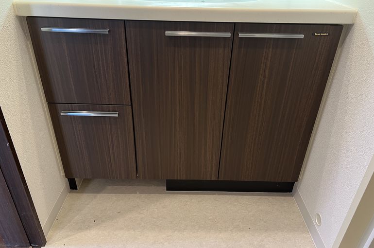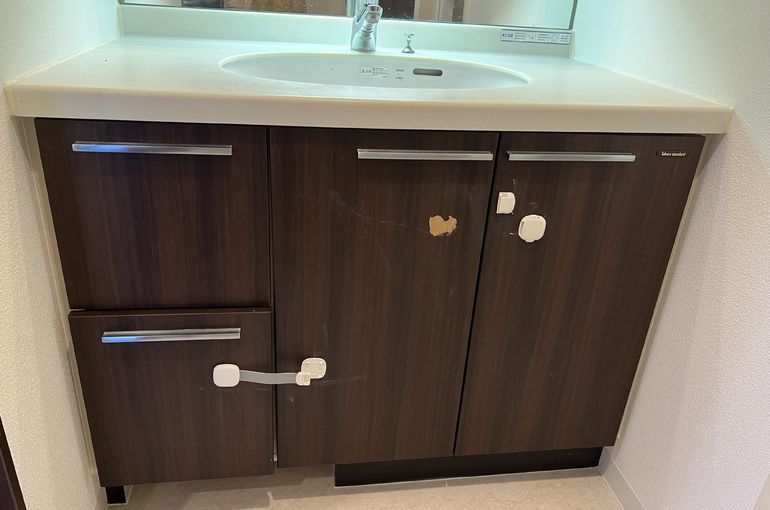 洗面台の収納にシートを貼る作業を行いました。特に、小さいお子様がいるご家庭では、収納を安全に保つための工夫が必要です。